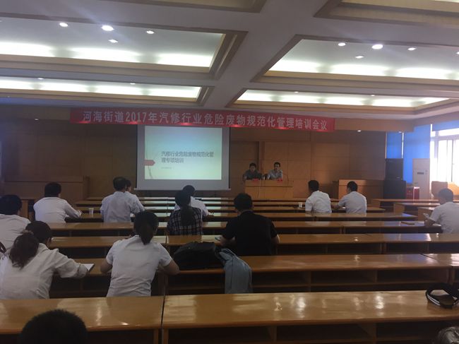 为贯彻落实《河海街道2017年汽修行业危险废物规范化管理专项整治行动方案》,进一步加强辖区内对汽修行业危险废物监管力度,督促企业落实各项规范化管理要求,2017年5月17日,河海街道环保办组织辖区内汽修企业召开危险废物规范化管理工作会议,辖区43家汽修企业参加。