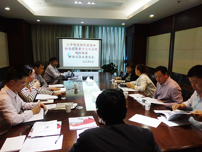 会上刘教授首先对三井街道“十二五”期间经济社会发展作了一个简要回顾。其次结合区域发展的实际着重从指导思想和发展思路、发展定位与目标、产业转型、优化空间、社区共享发展、人才引进培育等方面对街道“十三五”规划纲要内容作了较为详细的解读。参会代表们对街道“十三五”规划中的自身定位和发展目标积极阐述了自己的看法,并结合各自了解的情况提出了意见建议。代表一致认为该规划纲要思路清晰、定位明确、目标可期、内容全面,具体路径措施有很强的现实针对性。通过解读让与会代表们在回顾过去五年所取得的丰硕成果的基础上,对今后五年三井街道经济和社会发展方向和奋斗目标有了更深刻的理解。纲要的形成将有利于街道凝聚全社会力量为建设好创新、协调、绿色、开放、共享的新三井而共同努力奋斗。