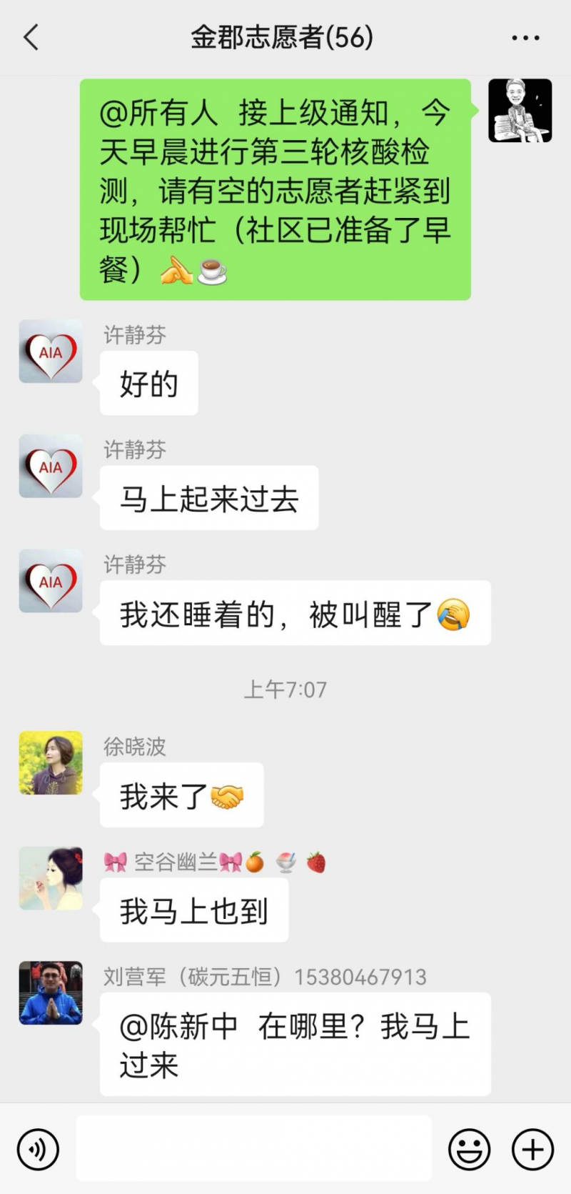 “核酸检测工作往往准备时间少,任务紧急,志愿者召集确实存在难度,但疫情就是命令,金郡好邻居志愿者们总是二话不说,召之即来、来之能战、战则必胜、永不言败。”经过三轮核酸检测实战演练,陈新中对未来信心满满。