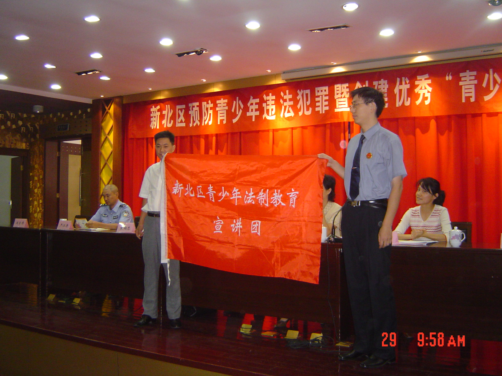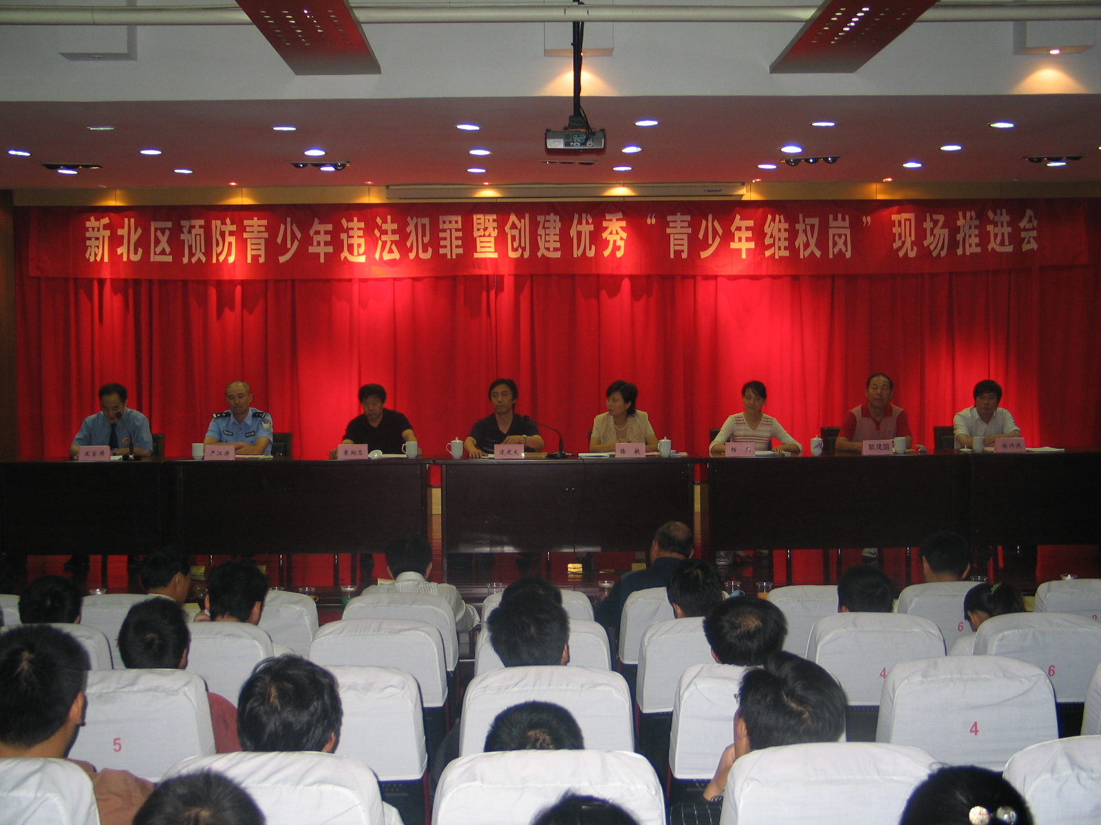 9月29日,全区预防青少年违法犯罪暨创建优秀“青少年维权岗”现场推进会隆重召开。区委常委、区综治委预防青少年违法犯罪工作领导小组组长陆敏出席会议并作了重要讲话。 区“预防工作”领导小组成员、各 镇、街道“预防工作”领导小组组长、团(工)委书记、综治办副主任、全区中小学分管副校长以及新北区各级优秀“青少年维权岗”代表和全区中小学生代表共500多人参加了会议。 会上,区委常委陆敏为新成立的“新北区青少年法制教育宣”授旗,团区委副书记、区“预防”工作领导小组副组长兼办公室主任杨杰布置了下一阶段的工作,学生代表宣读了“践行荣辱观,做合格小公民” 的倡议书,分别获得江苏省和常州市优秀“青少年维权岗”单位:新北区人民检察院和新桥中学作了工作经验交流。全区12家区级优秀“青少年维权岗”受到了表彰。