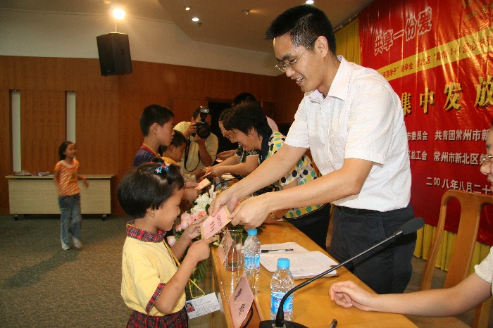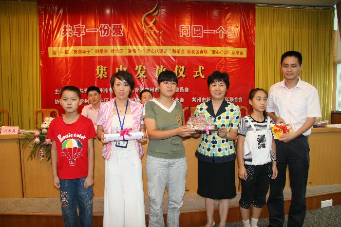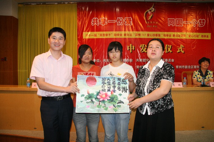 2008年8月29日下午,由常州团市委、新北区团委主办,新北区总工会、新北区妇联、新北区青联协办的“共享一份爱 同圆一个梦——新北区爱心助学金集中发放仪式” 顺利举行。 仪式上,全区30名家庭困难、品学兼优且今年考入高等院校的应届全日制本科大学新生获得了3000元/人的“芙蓉学子”助学金,20名贫困中小学生共获得1.3万元的“真情1+1 爱心扶春苗”爱心助学金,5名贫困小学生共获得2500元的新北区青联“爱心行动”助学金,资助总金额达10.55万元。“贫困并不可怕,可怕的是精神上的颓废与麻木,而物质、精神两重的帮助使我化生为海燕,直面迎接暴风雨。”这是受助者的真诚感言。同学们用自己制作的画、幸运星表达了对资助者的感谢,并表示今后将努力学习、锤炼意志、锻造品德,怀一颗感恩之心对待生活,用自己的行动把这份爱心传承下去,帮助更多的人。 新北区副区长胡秀芳参加了仪式并作了重要讲话,她肯定了我区爱心助学活动在服务青少年成长成才方面发挥的作用,并提出了三点希望:希望同学们正视困难,矢志不渝;希望全区各级工青妇组织把爱心助学工作做得更实更好;希望社会各界继续支持和参与爱心助学活动。 团市委副书记夏明、团市委学少部副部长张永波、新北区政协办公室主任周华军、新北区妇联主席沈春英参加了发放仪式,仪式由团区委书记曹瑜主持。