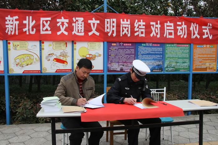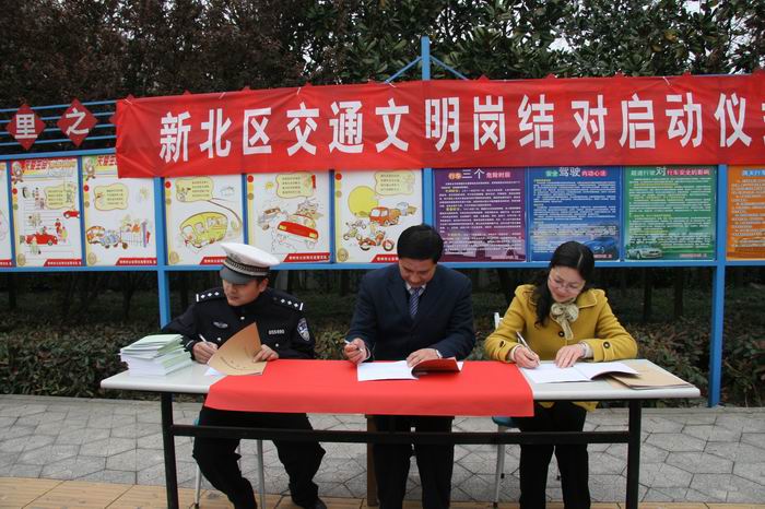 为积极响应“文明在手中——文明环境,文明在脚下——文明交通,文明在心中——文明关爱”的号召,积极投入“建设文明交通市,争当文明出行人”的实践活动,区文明办、团区委、区交巡警大队联合开展了交通文明岗结对共建活动。 2009年4月3日上午,河海街道河海社区、富都社区,三井街道府田社区、三井社区率先行动,积极参加到共建活动中来,于高田岗举行了新北区交通文明岗结对启动仪式。团区委书记曹瑜作了动员讲话。各社区分别与岗亭签订了结对共建协议。此后每周六上午8:30—10:30,我们各结对社区的志愿者将分批上岗,开展交通志愿服务,引导文明交通。结对的河海岗、大饭店岗、高田岗、三井岗的交巡警也将走进结对社区,开展为民服务。 接下来,我们还将将交通文明行为延伸拓展到家庭、学校、机关和企事业单位,按照机关包干部、学校包师生、企事业单位包职工、社区包居民、村镇包村民的原则,把交通文明行为的宣传教育落到每一个条线上,把争当文明出行人责任分解细化到每个人身上。
