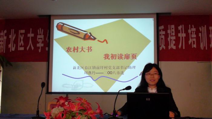 4月14日至4月17日,新北区近年来公开选聘的88名大学生村(社区)干部在河海大学(常州校区)参加了由区委组织部、区委宣传统战部、区委党校和团区委共同举办的全区大学生村(社区)干部能力素质提升培训班。区委常委、组织部部长陈正春出席开班仪式并作动员讲话,陈部长要求参加培训的全体学员要统一思想,提高认识,认清农村发展面临的新形势新任务,切实增强参加学习培训的主动性;要抓住精髓,联系实际,认真学习,努力提高建设社会主义新农村的本领;要遵守纪律,集中精力,专心学习,确保学习培训取得实效。动员结束后,副区长蒋雪勤为全体学员作了一堂当前全区农村工作形势和新农村建设重点的专题辅导报告。 这次为期4天的培训内容丰富,针对性强,既有全区农村工作形势和新农村建设工作重点讲解、农村矛盾纠纷调解主要方法介绍、“SYB”创业培训等集中授课,还安排了全省“新农村建设带头人科学发展能力培训工程”部分讲课录像播放、能力素质拓展训练和大学生村(社区)干部工作成果展示,同时组织观摩了常州圣王果蔬有限公司、常州绿农养殖有限公司和彩叶树种植基地等农业科技示范基地。通过系统的学习培训,拓宽了学员眼界,深化了学员对新农村建设的认识,起到了很好的学习效果。全体学员纷纷表示要以本次学习培训为新的起点,静下心来回顾总结工作,思考存在问题,理清下一步工作思路,真正做到融会贯通、学以致用,更好地服务社会主义新农村建设。  4月14日至4月17日,新北区近年来公开选聘的88名大学生村(社区)干部在河海大学(常州校区)参加了由区委组织部、区委宣传统战部、区委党校和团区委共同举办的全区大学生村(社区)干部能力素质提升培训班。区委常委、组织部部长陈正春出席开班仪式并作动员讲话,陈部长要求参加培训的全体学员要统一思想,提高认识,认清农村发展面临的新形势新任务,切实增强参加学习培训的主动性;要抓住精髓,联系实际,认真学习,努力提高建设社会主义新农村的本领;要遵守纪律,集中精力,专心学习,确保学习培训取得实效。动员结束后,副区长蒋雪勤为全体学员作了一堂当前全区农村工作形势和新农村建设重点的专题辅导报告。 这次为期4天的培训内容丰富,针对性强,既有全区农村工作形势和新农村建设工作重点讲解、农村矛盾纠纷调解主要方法介绍、“SYB”创业培训等集中授课,还安排了全省“新农村建设带头人科学发展能力培训工程”部分讲课录像播放、能力素质拓展训练和大学生村(社区)干部工作成果展示,同时组织观摩了常州圣王果蔬有限公司、常州绿农养殖有限公司和彩叶树种植基地等农业科技示范基地。通过系统的学习培训,拓宽了学员眼界,深化了学员对新农村建设的认识,起到了很好的学习效果。全体学员纷纷表示要以本次学习培训为新的起点,静下心来回顾总结工作,思考存在问题,理清下一步工作思路,真正做到融会贯通、学以致用,更好地服务社会主义新农村建设。