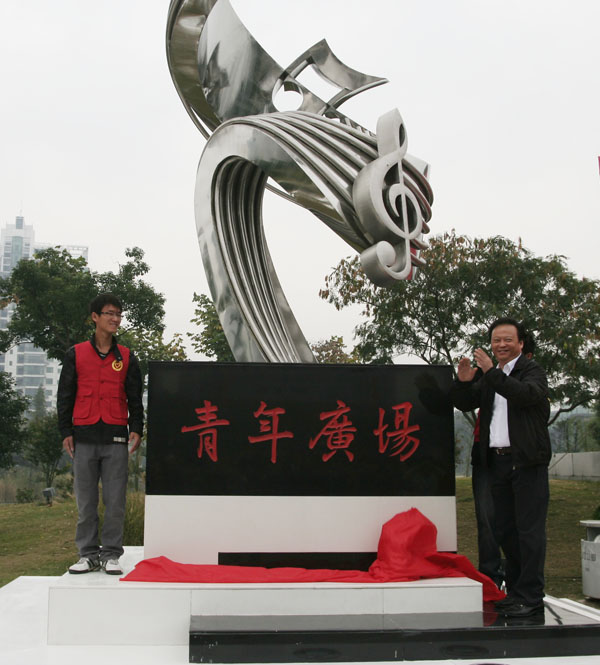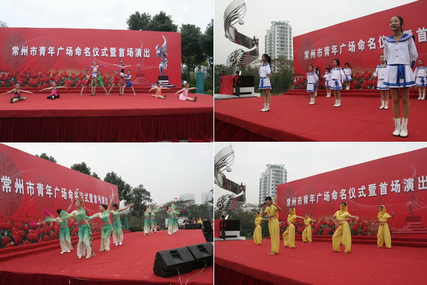 2009年11月7日上午,常州市“青年广场”命名仪式在我区中心公园隆重举行,市委副书记邹宏国出席命名仪式并为广场主体雕塑揭幕。 青年广场由主体雕塑和广场两部分组成。主体雕塑的基座造型为玫瑰、音符两组辅助雕塑台阶,黑白色的台阶,象征着律动的琴键和音符,演奏着富有青春生命力的节奏,奏响着时代的最强音。整个台阶由五节白色台阶和四节黑色台阶共同组成,寓意永远进步的“五四”精神。 雕塑的主体造型像一朵优美的花,从玫瑰、音符两组辅助雕塑过度而来,仿佛一阵轻风吹落了几朵花,花瓣滑过五线谱,与律动的青春音符一起跳跃;同时,它的造型又像燃烧的火炬,象征着一把五四精神的火炬,把“爱国、进步、民主、科学”的无私精神在一代代青年人手中传递;雕塑的主体围绕镶嵌着音符,是青春的舞动,是向上的旋律,整个造型体现年轻人朝气蓬勃和青春向上。 命名仪式结束后,广场上还进行了精彩的演出。我区特色社团推选的健美操《青春魅力》、幽默剧《快乐三部曲》、印度舞蹈《天竺少女》、歌曲联唱《校园民谣串串烧》等节目纷纷登上了舞台,他们用歌声、用舞蹈为市民献上了一顿丰盛的精神大餐。