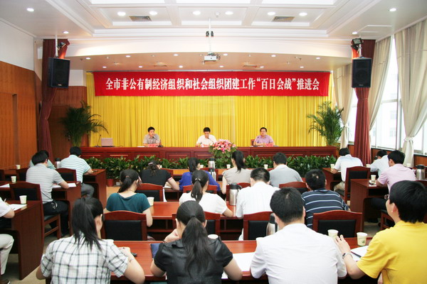 7月16日下午,团市委在新北区政府创业厅召开全市非公有制经济组织和社会组织团建工作“百日会战”推进会,各辖市、区团委负责人、全市省级以上开发区团委负责人、团市委机关各部门负责人参加了此次会议。 区委常委、组织部部长陈正春首先致辞,他表示新北区经济平稳快速发展,非公有制经济所做的贡献非常大,非公经济组织、社会组织团建工作的突出地位和重要作用日益突显。新北区委将全力支持这项工作,健全完善“党建带团建”工作机制,打好非公有制经济组织和社会组织团建这一仗。 团市委副书记严俊就全市非公有制经济组织和社会组织团建工作“百日会战”进行了部署。武进经发区团委、新北区团委、财政局团委、人防办团委分别就开发区、高新区、会计师协会、华景大厦楼宇建团工作进行了交流。 最后,团市委书记胡竹讲话,他提出了“三个再明确”工作意见:一是目标再明确,各级团组织要进一步明确“百日会战”提出的工作目标,将团建工作任务快速部署落实,打响“百日会战”;二是责任再明确,团市委、各辖市、区团委、各乡镇、街道团委要合力推进团建工作,确保目标任务的完成;三是要求再明确,要一手抓有效率组建,一手抓有效用运行,做到建团和团建的无缝对接;要一手抓整体推进,一手抓典型带动,总结提炼经验;要一手抓督查落实,一手抓联系指导,促进非公团组织建起来,转起来,活起来。