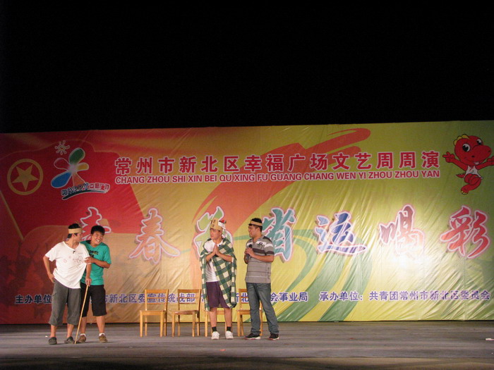 2010年8月21日晚,在薛家中心广场,由新北区团委、常州工学院团委承办的幸福广场文艺周周演之“青春为省运喝彩”主题文艺晚会成功举办。晚会在热闹欢快的歌舞《青春斗》中隆重开场。节目形式多样,精彩纷呈,有相声《吹牛》、诗朗诵《世博颂》、话剧《八戒娶亲》、女生独唱《青藏高原》……一个半小时的演出,展示了我区团员青年的风采,同时也赢得了群众阵阵掌声,为大家提供了丰盛的文化大餐。区委宣统部副部长江天舒等领导观看了整台演出,并与演员们合影留念。