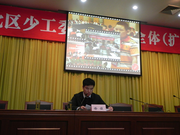 2012年3月15日下午,新北区少工委一届三次全体(扩大)会议在区政府创业厅召开,区少工委委员、各镇团委、街道团工委负责人和各小学少先队大队辅导员出席会议。 会上,区少工委委员审议了《关于新北区少工委主任、副主任、委员卸职替补的确认案(草案)》,团区委副书记徐俊担任区少工委主任。区少工委主任、团区委副书记徐俊代表区少工委作工作报告,团区委书记万丽平、区社会事业局副局长、教育文体局局长卞优文分别作重要讲话。 2012年区少工委将以“火炬工程”为统领,抓好“一个核心”:以灌输培养少年儿童对党和社会主义祖国的朴素感情为核心,深化少年儿童思想引领,围绕少先队组织根本任务,发挥少先队实践育人优势,牢牢抓住喜迎十八大、纪念建团90周年、建区20周年等契机,以“红领巾心向党”、“我与高新区共成长”为主题,扎实有效地开展丰富多彩的教育活动。实施“两大工程”:实施“少先队文化工程”,开展“金色童年”主题活动,探索《少先队活动(课程)指导纲要》课程化实施,活跃少年儿童精神文化;实施“青少年创新工程”,深化“红领巾爱科学”活动,开展优秀红领巾“火炬小社团”评比,激发少年儿童的活力和创造力。推进“三项重点工作”:探索建立“新北区优秀辅导员互学互促工作室”,提升辅导员专业素养,推动少先队工作的科学化发展;加强片区交流及基层调研工作;开展优秀“火炬工程”调研文章评选工作,推动少先队基础理论、应用理论和实践创新,形成一批内容鲜活、富有理论深度和现实指导意义的调研成果,有效指导和促进全区少先队工作的开展。