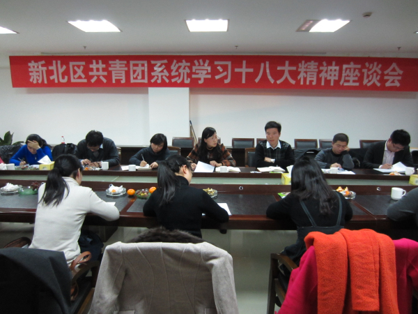 11月28日下午,团区委在春江镇政府会议室召开了新北区共青团系统学习十八大精神座谈会,团区委全体工作人员,各镇、街道和园区团组织负责人参加了会议。 团区委书记万丽平指出:党的十八大精神特别是胡锦涛同志的报告,博大精深、意义深远,要学习好、领会好、贯彻好,必须花更多的时间,下更大的功夫。要深入学习十八大精神,专题研讨十八大报告中的新思想、新观点、新论断,尤其要把握好报告的主题和灵魂,进一步提高认识,统一思想。我们青年人要听从总书记的教导,积极响应总书记的号召,树立正确的世界观、人生观、价值观,永远热爱我们伟大的祖国,永远热爱我们伟大的人民,永远热爱我们伟大的中华民族,投身到中国特色社会主义伟大事业中去,让青春焕发出绚丽的光彩。 大家纷纷表示要结合自身实际,深入学习、贯彻十八大精神,做好本职工作,为高新区率先基本实现现代化作出自己的贡献。