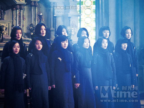 《金陵十三钗》中的教会女学生与《姬百合之塔》中的女学生年龄相仿,形象也略有相似,可以放在同一个肖像谱系中来比较。《姬百合之塔》中的女学生是单质的、平面化的,她们作为一个整体,除了最核心的主人公(也是最重要的少女明星),几乎分辨不出个体。《金陵十三钗》亦然,比起风姿各异的妓女群像,女学生们显得面目模糊,连主人公书娟也不甚清晰,她们的蓝布长衫和“姬百合”们的水手服具有同样的符号功能,是战争年代纯洁无辜的受害者的标签。
