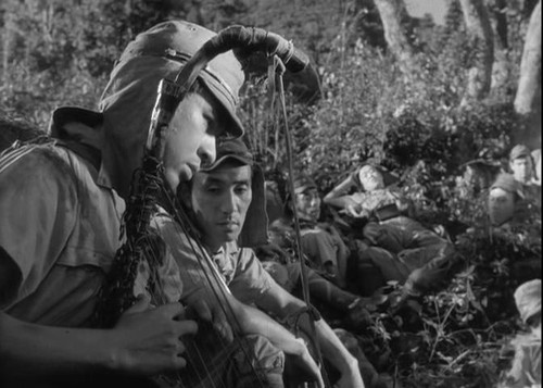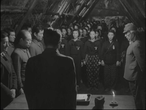 另一方面,军官往往以日本现代化进程推动者的面目出现,军官活动的环境经常是现代化、西方式的,饮食和日常用品都颇为精致,军官可能有风雅的业余爱好,音乐、绘画、文学等等。本片中长谷川自弹自唱的《故乡》是日本二战电影中出现频率最高的歌谣,“追兔子玩的那座山,钓鱼玩的那条溪,现在还是频频梦见,不能忘记的故乡。”无论是战地的士兵,还是远东军事法庭羁押的战犯,一旦唱起这首歌,他们的形象便被柔化了,从军国主义的执行者变成了受历史捉弄的受害者。