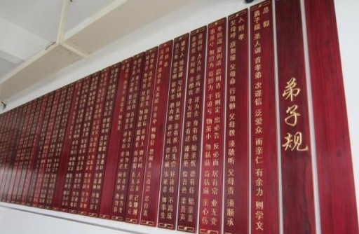 罗溪中心小学在校园文化建设时,在二楼走廊建设了《弟子规》墙,旨在提高学生的人文修养,积淀他们的文化功底,让孩子打好传统美德的根基。 罗小老师充分利用学校这一课程资源,尤其是语文学科老师,把本学科与教育资源的开发利用有机结合起来,师生共同诵读、学生展示诵读《弟子规》,指导学生理解《弟子规》。《弟子规》里有丰富的思想性与深刻的教育性,对学生的精神领域产生的影响是极其深远的,因此,我们特别注意教学内容的价值取向,在教学中,尊重学生的独特体验,同时教师注意予以正确引导。高年级老师让学生结合生活写读《弟子规》的启示,编写了班级作文专辑,使学生充分汲取《弟子规》中的道德精华与文化精髓;使学生获得道德文明素养的同时,获得中华传统文化的素养,真正落实学生的道德认知,启动学生的真情实感,提高学生对生活、对社会认识的能力,使师生在教学活动中共同发展。
