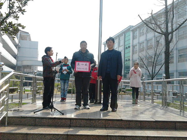 3月26日上午,艳阳高照,全校师生集合在明媚的阳光下,举行了隆重的捐赠仪式,当受助孩子的伯伯从校长手中接过这笔珍贵的“礼物”时,孩子们欣慰地笑了,此刻,他们是最善良的,最可爱的,最美丽的。 这次爱心义卖活动,以“放飞爱心——做雷锋式的好少年”为主题。在此前的活动中,同学们聚集在操场上,不遗余力地吆喝推销物品,竭尽所能地购买奉献爱心。一件件充满爱心的物品被孩子购买,一份份充满爱心的钱款由孩子捐献。在短短一个半小时的爱心义卖活动中,全校共筹得爱心款14375元。这次全部捐赠给了本校遇到困难的学生吴家成。在活动中,师生们带给我们许许多多的感动,特别是四(1)黄涵菲同学一个人就捐了500元,程能杰也捐了355元,三(1)班的赵焱捐了341元,五(2)班的恽恩泽捐了223元,三(2)班的蒋小琴老师和她的爱人也伸出了热情的双手,各捐了200元。还涌现了许许多多的“爱心好少年”,他们用行动诠释了什么叫大爱;他们又用行动证实了新时代儿童的美丽风采。