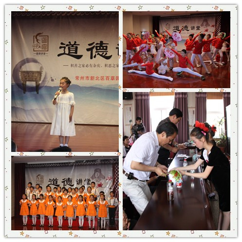 道德讲堂,生命成长;美德之花,幸福绽放。5月31日上午9点,百草园小学“5+2”道德讲堂展示活动在一曲意韵悠长的《公民道德歌》中拉开了帷幕。 唱一首歌曲:“道德重如山,道德贵似金,人生道路上有德才能行。”一曲《公民道德歌》唱出了道德的深刻内涵。百草园小学师生齐心合作,把道德的美演绎得淋漓尽致。 诵一段经典:在轻快而又朗朗上口的音乐声中,孩子们把《弟子规》中的“仁义礼智信、温良恭俭让”融会成美德赞颂曲上一个个拨动人心的音符。 看一段视频:2011感动中国的颁奖礼上,被称为雷锋传人的郭明义用自己微薄的收入帮助了许许多多的人,他就是这样一个把帮助别人当成是快乐、踏实的一个普通党员。他的感人故事感染了在场的每一个观众。百草园小学的学生更是用一段优美的民族舞蹈《再唱山歌给党听》表达了对郭明义这样的普通党员的敬意。 讲一个故事:在百草园小学魅力之星评比之关爱之星的评选中,有这样一位同学,小小年纪就懂得关心他人,他就是三(3)的倪昀,在家、在学校、在社会,他时刻都把关心别人当做是一件幸福的事。动人故事的讲述、关爱场景的照片,无不让大家对他竖起大拇指。 做一番点评:看完郭明义的事迹、听完倪昀同学的故事,大家纷纷谈了自己对关爱的理解。五(1)班的曹雯萱谈了关爱他人所体会到的给予的幸福;倪昀的妈妈谈了自己在家以身作则,以榜样的形式教育孩子要关心他人的经验;王宣艳老师从教师角度出发,谈了作为教师只要有了职业的担当,就一定能让我们学生的生命幸福绽放。 背一句格言:“做一个诚实的人、做一个宽容的人、做一个勤劳的人、做一个善良的人、做一个正直的人”这句格言让在座的每一位观众都深受启发。相信我们的孩子在今后的学习生活中,一定能铭记并践行这句格言。 送一份吉祥:道德讲堂滋养生命,成语文化润泽心灵。在一首欢快的《文明新风歌》中孩子们为大家送上了古色古香的、写有关爱成语的书签。 道德和风吹遍校园,成语芬芳滋润心灵。在百草园小学独创的《成语儿歌操》中,道德讲堂落下了帷幕。本次活动受到了各位外市领导、区内学校同行以及家长们的一致好评。相信,在百草园小学全体师生的共同努力下,“道德讲堂”一定会绽放出更加灿烂的光芒!
