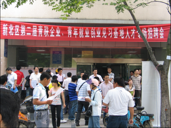 2010年,6月18日上午,由新北区团委、区青联、区人力资源和社会保障局共同举办的新北区第二届青联企业、青年就业创业见习基地人才专场招聘会在新北区人力资源市场举行。此次招聘会共有20家企业参加,提供近700个岗位,涉及机械制造、服装、纺织、建材、电子、建筑安装、旅游、物流、营销等30余个行业。从5月份开始,团区委、区人力社保局就通过网络、横幅等多种宣传手段发布招聘会信息,招聘会现场吸引了全区1000多名应届和未就业大中专毕业生、职高毕业生、下岗失业青年前来咨询应聘,现场气氛热烈。 据悉,新北区青联每年都会利用青年就业创业见习基地,或者组织青联企业专场招聘会等形式,来为青联企业搭建选人用人平台。