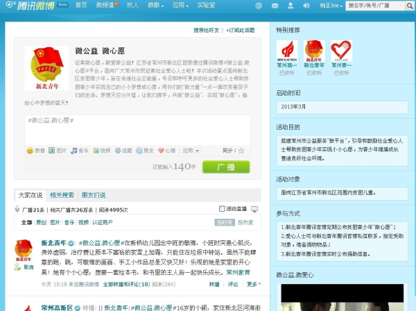 2013年2月25日起,团区委启动了“微公益•微心愿”——情暖新北“薪火”青年志愿服务活动。由团区委通过多渠道征集新北区贫困青少年“微心愿”,《新北青年》腾讯微博开设“微公益•微心愿”话题版块,定期发布贫困青少年的“微心愿”,并向社会发出倡议,号召爱心人士用自己的“微力量”帮助贫困青少年实现心愿。《新北青年》腾讯微博还将跟踪救助过程,及时发布救助信息,传递正能量。