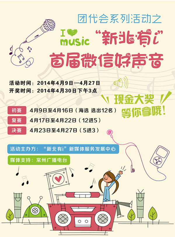 为喜迎新北区第四次团代会的到来,“新北有i”新媒体服务发展中心重磅推出团代会系列主题活动。2014年4月9日至4月27日,团代会系列活动之“新北有i”首届微信好声音重磅来袭。只需关注“新北有i”微信公众帐号,通过微信录制1分钟以内的歌曲片段,唱一首关于青春的歌,语音录制开头必须说出活动主题:“新北有i”微信好声音再进行演唱,然后发送至“新北有i”微信公众帐号,即可获得参赛权。 活动时间:2014年4月9日至4月27日 颁奖时间:2014年4月30日下午3点 活动主办方:“新北有i”新媒体服务发展中心 媒体支持:常州广播电台 奖项设置: 一等奖(1名)300元 二等奖(1名)200元 三等奖(1名)100元 入围奖(2名)万达观影券2张 活动赛制:活动分为初赛、复赛和决赛三个阶段。初赛时间为2014年4月7日至4月16日,评选出12名优胜者进入复赛。复赛时间为4月17日至4月22日,参加复赛的选手必须通过微信录制一首较为完整的歌曲片段,时间在1分钟以内,语音录制开头必须说出活动主题再进行演唱,评选出6名优胜者进入总决赛。决赛时间为4月23日至4月27日,6名决赛选手必须通过微信重新录制一首歌曲片段,语音录制开头必须说出活动主题再进行演唱。任一阶段所选曲目必须与青春相关。4月30日下午3点,我们将评选出“新北有i”首届微信好声音。 “好声音”有惊喜: “新北有i”首届微信好声音前三名的青将会收获意想不到的惊喜哟! 1.加入常州广播电台的广播艺术团行列,享受广播电台户外演出的优先推荐; 2.有机会走进现代传媒中心直播室,做客音乐电台直播节目,与爱听DJ一起分享好音乐; 3.收获持有常州广播电台主持人签名的《爱畅歌之春色》CD一张。 评奖规则: 1.获奖者必须是“新北有i”微信公众平台的粉丝; 2.微信录制任意歌曲开头必须说出活动主题“‘新北有i’微信好声音”再进行演唱,录制歌曲时间控制在1分钟以内; 3.每个帐号若发送多条语音以最后一条为准,一个帐号只能以一条语音参赛; 4.秉持着声音至上娱乐万家的观念,“新北有i”鼓励广大粉丝通过以各种形式的声音参赛; 5.“新北有i”会邀请“新北有i”新媒体服务发展中心领导、知名常州电台DJ与资深音乐人对参赛语音进行评选,评选过程公平、公正、公开,三方评审力保在符合要求的微信中选出一位“新北有i”首届微信好声音。 如对本活动条款及细则有任何疑问,可回复“新北有i”微信公众平台进行互动。