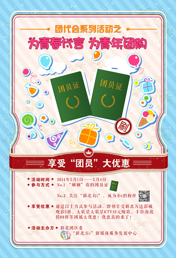 新北万达影城观影5折、大歌星KTV10元嗨歌、丰臣海底捞88折……在新北区第四次团代会暨五四青年节到来之际,新北区团委创18luck手机客户端下载 青年方式,开展团代会系列活动之“为青春代言,为青年团购”活动。在5月1日至4日期间,只需要亮出你的团员证或者关注“新北有i”微信公众平台,即可享受涵盖美食、娱乐、文体、休闲等多领域的团属超值优惠。参与商户包括万达影城、大歌星、芒可、百特喜、山度士、ringroll、可酷啦、热风,丰臣橙天嘉禾影院、agogo、潘晓婷、海底捞、燎原教育,云咖啡、独家记忆、仙鹤体育馆、中意麻辣烫河海店、书式生活等(具体优惠内容见“新北有i”微信公众平台)。赶紧翻出团员证,或者拿出手机扫一扫“新北有i”微信公众平台的二维码!