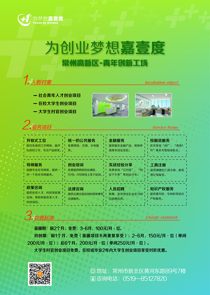该工场倡导一站式服务,申请苗圃项目的青年如果在6个月后成立公司,还可继续申请初创项目。 工场地址:新北区黄河东路89号河海商务大厦7楼。联系方式:85127566(新北区团委),“嘉壹度”(微信公众平台),236311282(QQ群)。