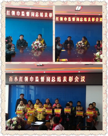 为了落实常规管理,抓实养成教育,切实发挥学校少先队“红领巾监督岗”在“自我管理、自我教育、自我服务”中的作用,同时,为了表彰“先进值日生”,激发广大“红领巾监督岗”小干部的工作热情,1月18号下午,在马丽老师的组织下,百丈小学的小干部们在会议室召开了2013-2014年第一学期“红领巾监督岗”总结表彰大会,并邀请到鄂校长一同参加。 会上,马老师总结本学期红领巾监督岗工作情况,从工作开展的情况及存在的问题中进行思考讨论,并及时表彰了在这一学期中表现优秀的“值日生”,这些同学尽心尽职,任劳任怨的优秀表现,得到了同学们的认可。最后,鄂校长结合学校的工作对“红领巾监督岗”的同学们进行了鼓励,希望红领巾监督岗成员成为全校学生的楷模,既是全校学生行为的监督者,更要为全校师生服务好。 |