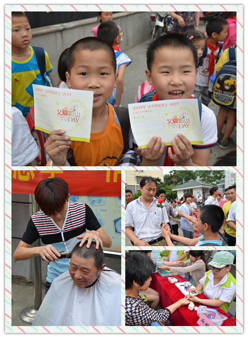 炎热的六月,是考试季,是足球季,更是感恩季。6月13日下午3:30,由三井街道、泰山小学、三井卫生院等多家单位联合举办的“温馨感恩季情系父亲节”的大型公益关爱活动在泰山小学门口如火如荼地开始了。 父爱如山稳重、深沉,母爱似水慈祥、温馨,父爱可能不像母爱的那般外显、张扬,今天的这场活动给了孩子和父亲一次温馨的沟通机会。前期我们下发了感恩卡和心情卡,让学生悄悄地制作,上面写好自己对爸爸的祝福,并在活动当天邀请爸爸来接孩子,将这份惊喜当场送出,当天是父亲来接孩子的,还可获得一支可永久保存的丝网玫瑰花。 “爸爸,在这个特殊的日子里祝您身体健康、工作顺利!”小男孩腼腆地将贺卡和玫瑰花送出,爸爸也很惊讶:“只央求我今天一定来来,根本不知道会有这样的惊喜!”“老爸,你永远是我最亲的爸爸,我爱你!”一位小女孩已经扑到了爸爸怀里,爸爸高兴地抱起女儿:“谢谢亲爱的女儿!让爸爸抱抱吧,再大点爸爸就抱不动喽!”一位高个子同学悄悄递着贺卡默默地说:“你就看我的行动吧!”这位六年级的爸爸拿着儿子送的贺卡也有些不知所措:“太感动了,孩子大了,平时在家不怎么跟我说话,挺倔强的,没想到今天还能听到他的几句心理话……”一幕幕温馨的画面不断上演,一阵阵欢声笑语不时响起……同时心情卡片展板前也围观了许多群众,小小的卡片上,稚嫩的话语表达出对爸爸的爱,简单的线条勾勒出温馨的场景,一股股浓浓的亲情在人群中慢慢漾开……小记者们在这次活动中积极踊跃,穿梭于人群中记录着这些感人的素材,他们戴着小红帽,拿着采访本,也成为这次活动中一道亮丽的风景线。 与父亲节活动同时举办的还有的义务理发,免费测量血压、血糖,防灾宣传等公益活动,通过这些系列活动,让泰小学子在爱的氛围中深深明白了感恩,架起了与父亲沟通的桥梁,让我们的家庭更加和睦。