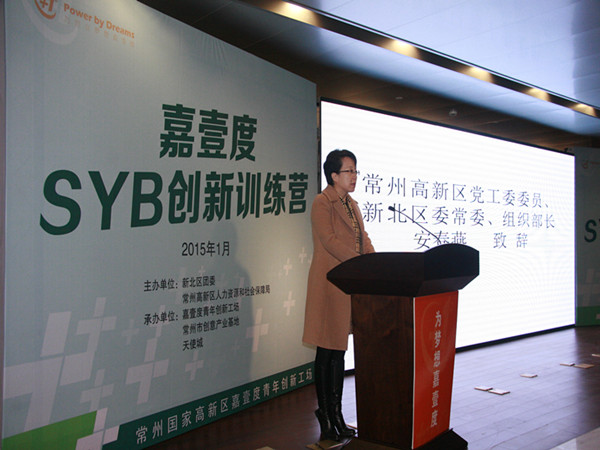 1月17日,18日,20日,为提升青年创新创业素质,营造“大众创业,万众创新”的良好氛围,“嘉壹度”青年创新工场举办2015年首期SYB创新训练营。常州高新区党工委委员、新北区委常委、组织部部长安春燕在开营仪式上致辞,常州团市委书记潘文卿,常州高新区人社局局长花震亚出席仪式。