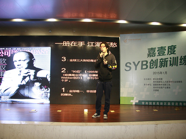 背景链接: “嘉壹度”青年创新工场,是由新北区委组织部、团区委、区青联、河海街道等部门联合打造,旨在向前延伸创新创业人才培养链,理念为0℃+1℃,梦想破冰(预孵化);37℃+1℃,梦想绽放(初期孵化);99℃+1℃,梦想升华(加速孵化)。创新采取“工位制”孵化模式,聚焦移动互联网、物联网等领域,为处于苗圃期、初创期的青年创新创业项目提供开放式工位、融资投资、创业导师、中介咨询等一站式服务,目前已集聚创新创业青年超过100人。 SYB的全称是“START YOUR BUSINESS”,意为“创办你的企业”,它是“创办和改善你的企业”(SIYB)系列培训教程的一个重要组成部分。其具备高度满足小企业家需求、学用结合、高度参与、模块化、游戏化、短时间、低成本、统一教材、大量后续服务、严格的质量控制等特点。 SYB培训是经国家劳动和社会保障部引入我国后,部分省市进行试点运行,取得了良好的效果。创业培训不仅使学员的就业观念发生转变,更激发了他们的创业意识,掌握创业技能,增强微小企业抗风险能力,使学员在短时间内成为微型企业的老板。我国从98年开始SYB创业培训试点工作,随着SYB创业培训在全国的全面启动和小额贷款政策扶持,解决了有志创业者创业时遇到的创业知识的欠缺和资金不足问题,探索了以培训促就业,以创业带就业的就业促进模式。实践证明,SYB教材通俗易懂、简明实用,培训模式符合中国国情。