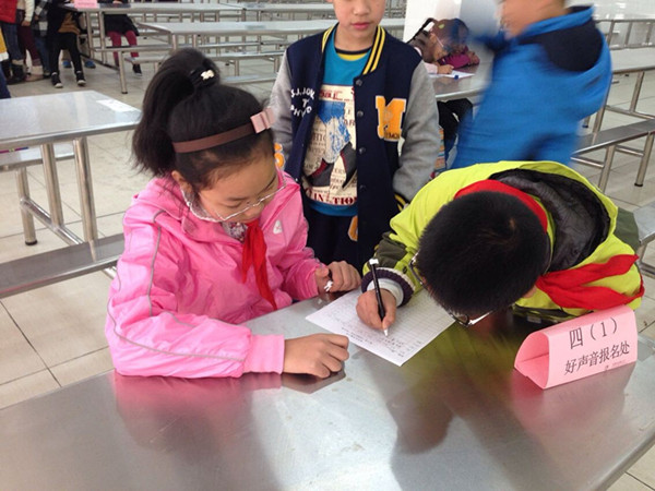 一年一度的“龙城好声音”在音乐组老师们的大力策划下,又将拉开帷幕。随着班级数量的不断增多,海选第一轮的形势也更为严峻。学校学生发展部改变策略,邀请即将担任新一届大队委的候选人们为所有的小龙娃进行海选的集体报名。11月17日中午12点30分,原本已经变得安静的学校食堂,一下子就沸腾起来,来自全校五个年级的小龙娃们飞奔而至,就为了能在报名表上及时写下自己的姓名。此次好声音,不但要清唱歌曲,还要说一则童谣。小龙娃在展示自己歌喉的同时,也将常州的优秀童谣加以传唱,一举两得。让我们一起期待下周的正式海选,祝愿所有的参赛选手们能赛出水平。(图文/小艳)