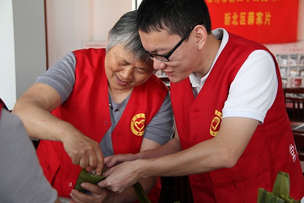 为迎接即将到来的端午佳节,进一步践行“奉献、友爱、互助”的志愿者精神,童子河社区组织了迎端午志愿活动。 5月21日早晨,社区工作人员准备好原材料来到老年活动中心,热心的志愿者们已经在此等候。糯米、粽叶、蜜枣等一一就位后,15名志愿者在中心多功能厅同时开工。年轻的志愿者们都是包粽新手,神情专注地跟着“志愿大妈”们学“手艺”,面对手中从未“驾驭”过的粽叶,丝毫不敢怠慢。而大妈们既分工明确、各司其职,又一边手把手教“徒弟”,一边谈论起各家包粽子往事,也是不亦乐乎。前来老年活动中心活动的老年人们也陆续围观,并且参与了手艺大讨论,现场十分热闹。 在老少志愿者们的共同努力下,两百多只粽子整齐排开。“主打”作品是蜜枣粽,寓意甜甜蜜蜜,形状丰富多样,三角形、牛角形、长条形等各有特色。“大家齐心协力,完成了这么多粽子,很有成就感。”一位大姐笑着说道,“在一起热热闹闹的,像是提前过端午节了!”活动现场除了欢声笑语、其乐融融,更感受到一种文化的传承和志愿精神的接力。 那么大家的作品将用于何处?社区工作人员提前对有关情况进行了解,列出部分特困人员名单作为赠送对象,这其中有复员军人、特困残疾人、独居老人、失独老人等,共十八户。社区将志愿者们带着真诚和爱心的“纯手工产品”逐一送到了这些弱势群体手中,虽然形式、物品都很简单,但大家知道自己一直有人牵挂十分感动,切实感受到了来自社区大家庭的温暖。