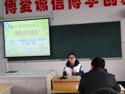 中队建设是学生、辅导员之生命介入其中的生活历程,也是内蕴生命活力、充满自主魅力、意蕴丰富、绵延发展的生活世界。孟河中心小学于3月14日下午,邀请了局前街小学许嫣娜副校长来我校为全体辅导员做“班级(中队)岗位建设”的专题培训。 丰富多彩的岗位活动能发挥队员主体性,让队员全员参与到中队管理中。在培训中,许校长以自身经验为基础,真诚地跟我们分享了她在辅导员工作当中如何以“争当小干部”的名义让孩子真正地参与到集体当中去并不断提高自身能力。她认为,在孩子入学之初,我们辅导员应该在关注队员,关注细节的基础上做到“多师范、多要求、多指导”,慢慢地让队员在不断变换的“劳动型岗位”“管理型岗位”与“文化型岗位”中成长,并在此过程中,逐步提高对队员的要求,成立管理小分队,让部分能力强的队员在快速成长的过程中带动一部分人的发展,与此同时,通过全员参与中队管理的方式让队员营造出一种民主和谐的班级氛围,让孩子深深地爱上这个他们都为之付出的“家”。 许嫣娜校长这种由扶到放的管理方式让我们为之感动,感动她为少先队员健康成长独到的思考。通过这次见培训,我相信在以后的工作当中,孟河中心小学的各位老师对于辅导员工作都会有自己新的思考,在不断提高少先队员能力的基础上解放自己,发展自己!