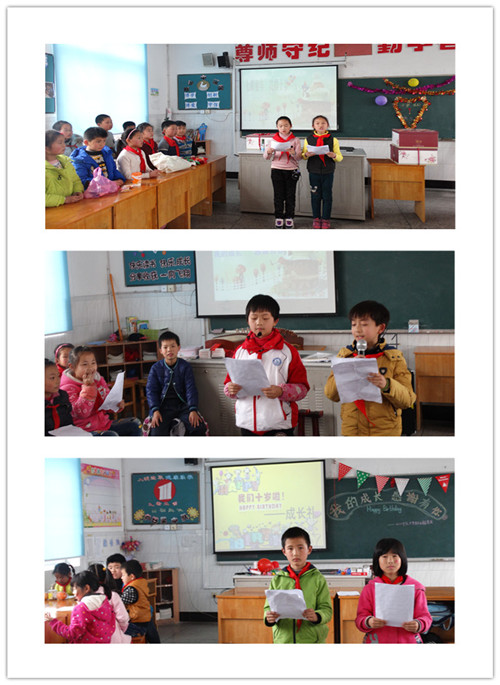 “我的成长,感谢有你”十岁生日成长礼是孟河中心小学生命教育月系列活动之二。3月18日下午,三年级组的辅导员和家长为队员们精心筹备了一场意义深远的十岁生日成长礼活动,旨在让队员们体验成长的快乐,承载爱与幸福,心怀感恩,同时激发队员们的梦想。 活动在父母们发来的语音祝福中拉开了序幕,很多队员在这温馨时刻流下了幸福和感动的泪水,全体队员演唱了歌曲《游子吟》,三(4)班的周斌、唐瑶等同学表演了诗朗诵《父爱和母爱》,表达他们对父母的爱的诠释与感恩,整个场面非常的感人。接着在成长与分享环节中,队员们表演了丰富多彩的节目。如有课本剧《受骗的小白兔》、古筝独奏《春到拉萨》、拉丁舞表演、歌舞《小苹果》、歌曲《好兄弟》、魔术等等,队员们一个个丰富的表情,夸张的动作,张扬着个性,展示着队员们的全面发展。他们在欢声笑语中分享快乐、领悟人生道理。 随着《生日歌》旋律的响起,各中队辅导员缓缓地推出了祝福的生日蛋糕。随着烛光的闪烁,队员们的心也跟着一起沸腾起来。在温馨的一刹那,队员们闭上双眼、十指相扣,默默许下美好、纯真的心愿。那写满祝福的心愿墙见证着队员们的憧憬,愿我们的明天更辉煌! 本次的十岁成长礼诠释了生命的意义,让队员们学会感恩,珍惜彼此,也必将在未来的岁月里助力队员们更好地成长。