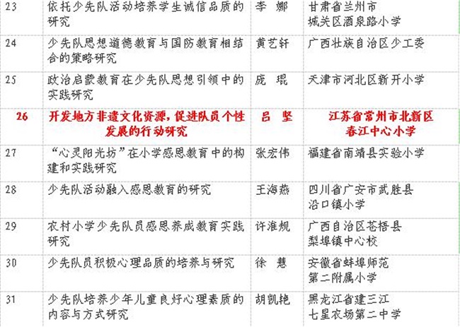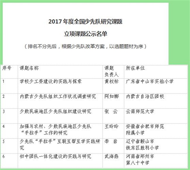 为深入学习贯彻习近平总书记系列重要讲话精神和治国理政新理念新思想新战略,贯彻共青团十七届六中全会和全国少工委七届三次全会精神,推进落实《少先队改革方案》,加强少先队理论体系建设,团中央、教育部、全国少工委委托中国少年先锋队工作学会、中国少年儿童新闻出版总社开展2017年度全国少先队研究课题申报工作。经过资格审查和评审委员会初评、终评,评审出4项课题为战略课题,17项课题为重大课题,40项课题为重点课题,100项课题为立项课题。并通过网上公示后发布名单。 自课题申报开始,我区各校少先队积极响应,区少工委、新北少先队名师工作室细心指导、精心组织、统一申报。最终,新北少先队名师工作室成员校春江中心小学的《开发非遗文化资源,促进队员个性发展的行动研究》成功入选2017年全国少先队研究立项课题,成为此次常州市申报成功的三个国家立项课题之一。 我区在下一步的少先队工作中将认真贯彻落实全国《少先队改革方案》,抓好“科研兴队”,让新北区少先队工作更扎实有效,更具勃勃的生命力。