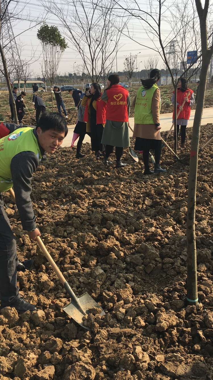天气晴朗、春风和煦,朱家弄村志愿者和新桥镇其他村、社区的志愿者们到S122与龙江路交叉口(S122南侧、新龙生态林二期北侧、龙江路东侧)开展植树活动。志愿者们热情高涨,4人一组,互相配合,1人扶树、2人填土、1人浇水,忙得热火朝天。
