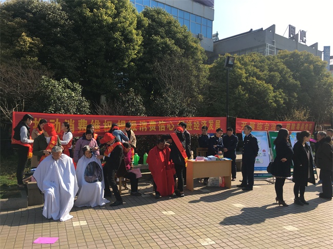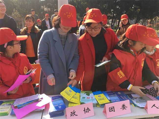 活动现场,志愿单位纷纷拿出看家本领、各显神通。工会向群众解释职工维权制度,妇联便也拿出宣传海报,倡导共建和谐家庭;医院拿出血压器,老年人纷纷来排队,市场监督局便请来理发师助阵,座无虚席;这边政协委员亲切询问群众困难,那厢司法部门解读养老保险政策……各个单位争相为群众答疑解惑,不甘示弱。同时,现场还有一群特殊的志愿者,身形虽小,却异常活跃,爷爷奶奶叔叔阿姨都对他们露出亲切的笑容,他们便是来自三个小学的小志愿者们,街头巷尾,他们不怕累不嫌远,积极发放各部门的宣传手册……