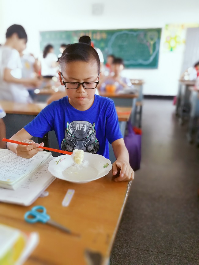 五月榴花妖艳烘。五色新丝缠角粽。端午未至,气氛已浓。 今晨,五年级的孩子们早早来到教室,朗朗的读书声中还有幽香暗藏,那是粽叶和腌渍好的馅料散发出的香气息。家长朋友陆陆续续走进教室。米粽、枣棕、肉粽……各小组在家长的指导下拿起粽叶笨笨拙拙地包起粽子。让粽子成型可不如看起来那般容易。“哇!粽叶破了!”“啊呀!米洒了!”“看!我包成了毛毛虫!”“哈哈哈,你那简直就是块饼嘛!”“来来来,孩子们跟着包,先把三片叶子有序叠好……”吵闹的声音渐渐弱下来,取而代之的是专注的神情。有模有样的粽子多了起来,胖乎乎的,让人迫不及待想看到它成熟的样子。或圆或方或尖的粽子排排躺在了锅里,加上水,插上电,等待就成了唯一要做的事了。 不过等待的过程总是漫长而又无趣的,我们来斗蛋吧!光溜溜的蛋不好看,大笔一挥,“小姑娘”“魔术师”“老爷爷”“超人”都来了,还有的蛋成了花园、天空的缩影,瞧着这么美,要拿去斗个高低还有些不舍呢。但勇士总是存在的,瞧那边两个不就斗上了吗。只听“咔嚓”一声,“花园”出现了裂缝,“天空”得意地笑了。壮烈牺牲的蛋接受了主人几秒钟的默哀就成了腹中餐,这也是一种贡献呢。 不舍得斗蛋的孩子在做什么?他们拿来了五色绳,手指翻飞间,有的绳子成了“长生缕”,戴在手腕上格外漂亮;有的绳子成了蛋的外衣,配上俏皮的蛋,就是一件绝妙的艺术品。 粽香越来越浓,盼望着,盼望着,粽子们终于熟了。孩子们迫不及待,团团围在锅前,开锅的那一刹那,热气蒸腾,浓香扑鼻,肚子也应景地叫了。即使被烫得吱哇乱叫,也不能放缓孩子们剥粽衣的速度,一口下去,还未下肚,人已先满足,真香啊……吃完一个,还有一个当然要带回家分享,这是我们一天的劳动成果呢。 胃里装着糯糯的粽肉,手里拿着香甜的粽子,鼻尖绕着淡淡的粽香,心间充盈着节日的欢愉。包粽子、画蛋、斗蛋、编五色绳,孩子们不仅体会到自己动手丰衣足食的满足感,还有浓浓的端午情。