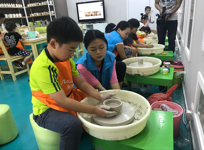 为丰富小朋友们的暑期生活,促进亲子间的互动交流,7月16日,河海街道阳光社区关爱新市民子女协会联合米罗加国际艺术馆举办暑假宝贝——亲子陶艺公益课程。 来自米罗加国际艺术馆的工作人员早早准备好水、陶丕、拉坯机等材料,老师们从简单的陶艺分类、历史讲起,让小朋友和家长们对陶艺有整体认识,接着,老师就制作陶艺的步骤、过程、注意事项等内容一一做详细讲解,并配合现场制作演示。小朋友们个个跃跃欲试,在老师的指导下小心翼翼地把陶丕放在拉坯机上转动,尝试着把陶丕塑成理想的形状。不一会,碗、瓶子、茶杯等形状就慢慢出现在小朋友们的手里。暑期公益课堂以丰富多彩的课程内容让小朋友们增长了见识、培养他们广泛的兴趣爱好,受到大家一致好评。阳光社区也将在后续暑期时段继续开展更多公益课程,让小朋友们度过一个充实有意义的暑假。