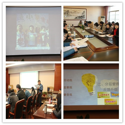 2017年1月15日上午,我校举行学期末辅导员工作总结交流活动。本次活动由学生处王瑛老师主持,王老师首先代表学生处汇报了这学期我们学校在队员活动和中队工作中获得的显著成就。一个学期下来,我校队员在各个辅导员老师的带领和指导下可以说是硕果累累,开展的活动更是丰富多彩,得到了许多家长的支持和关注,家长志愿者队伍也逐渐壮大起来,这也与我们每一位辅导员老师的辛苦付出息息相关。 为了提高辅导员老师的管理能力,加强各辅导员老师之间的沟通交流,更好的促进队员的健康成长。我校各年级优秀辅导员老师代表通过制作精美的PPT,把自己的教学理念、教学方法、队员一点一滴的成长瞬间融合在一起,从不同的角度毫无保留地与其他教师分享交流。金霞老师提出的“让爱永驻心间”为老师和队员架起了一座爱的桥梁,陈小丽老师谈的“和孩子一起该习惯”,从细节入手,结合孩子的年龄和心理特征着力于培养队员良好习惯给其他老师提供了良好的示范作用;倪佼老师就“让每一颗星星都闪光,点亮属于自己的星空”为主题结合三年级的小岗位建设提出了让自主管理,自我成长教育的一些具体的措施;曾霆老师鼓励队员开展丰富多彩的班队活动,与家长合作交流,为队员的成长提供了展示的平台;胡洁琼老师就班里的个案,与我们探讨分享了转化后进生的小秘诀;刘伟芬老师与他们班的孩子一路陪伴,从点滴学习和生活中不断反思和探索,促进孩子的成长,奏响了一曲美妙的“精灵”协奏曲,谱写出了一篇优美的乐章。在每一位辅导员老师代表交流过后,本年级的年轻老师更是进行了现场学习,从中学习好的管理经验,结合自己在中队管理上的不足提出了一些改进措施。 最后王老师对这次会议作了总结性发言,她肯定了老师们所分享交流的经验,并鼓励我们全体辅导员老师能够不断更新教育观念,不断学习,对老师们提出了做面向“未来”的辅导员老师,培育拥有“现在”的队员的美好愿想。心往一处想,劲往一处使。通过此次学期末辅导员工作总结活动,每个辅导员老师都有所收获,相信通过老师们的不断努力,西夏墅中心小学的明天会越来越好! (撰稿:倪佼 摄影:杨伟 审核:杨伟)