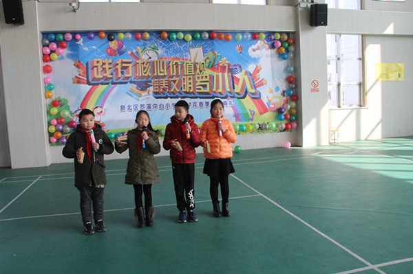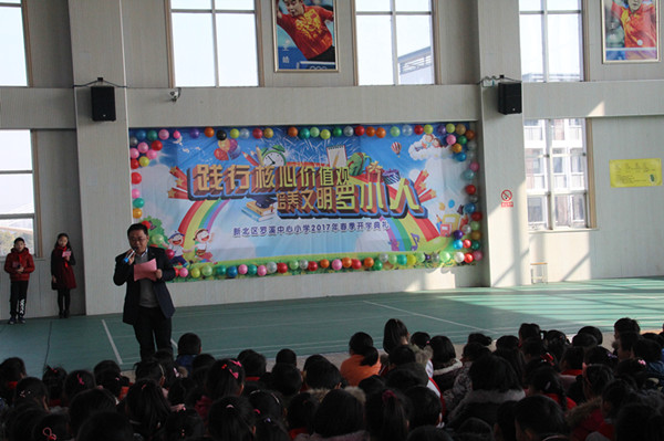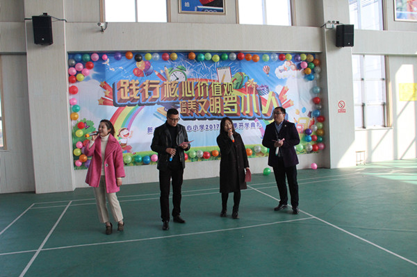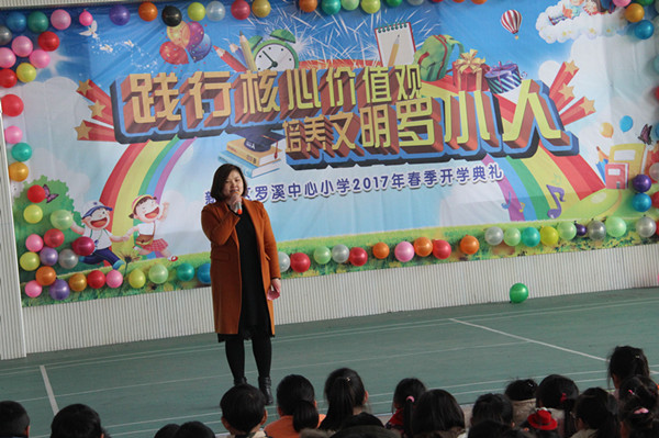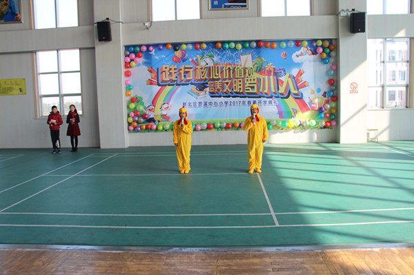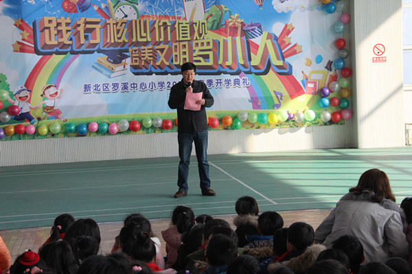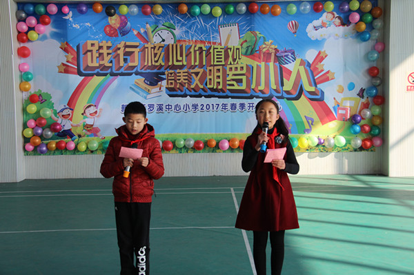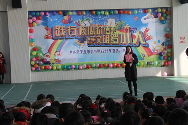2月13日上午,罗溪中心小学全校师生齐聚体育馆,举行了“践行核心价值观 培养文明罗小人”的开学典礼。 当两只可爱的“小鸡”唱着快乐的《开学歌》上场时,台下一片沸腾。主持人送上鸡年祝福语后,开学典礼就正式开始了。典礼共分为四个篇章,分别是“爱学习”、“会感恩”、“懂礼貌”、“能谦让”。