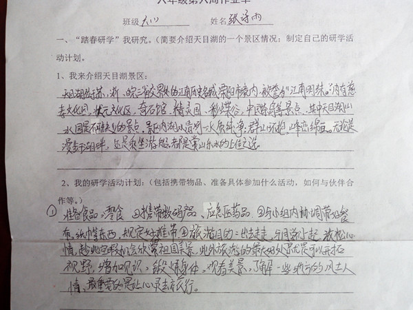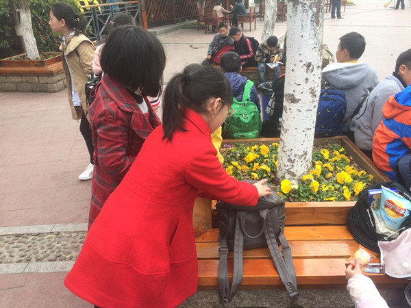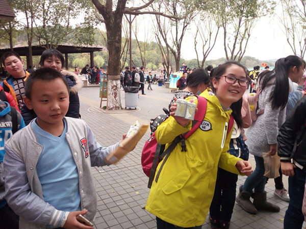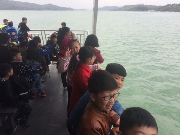 当然,队员们也没有忘记自己研学的任务:低年级的小队员,细细地欣赏小花小草,用心感悟着生命成长的神奇;四年级的队员正在进行生命之水的研究活动,他们看到天目湖水,碧波荡漾,青绿如斯,完美无缺地演绎出水的经典品质,感叹诗意美景的同时,也联想到身边众多地方的水质堪忧,而人们却不思悔过,为了一己私利,破坏着这生命的源泉。于是更加激发起了大家要保护水资源的意识;六年级的队员刚刚学完了《广玉兰》《夹竹桃》,就在景区内研究起了各类植物的特点,互相介绍认识些树木花草,把课内学习和课文探究有效地融在了一起;还有的队员走进湖畔茶园,探寻着春之新绿,静思中国茶文化的博大精深;更有部分队员,在老师的启发下,由天目湖联想到了溧阳悠远的历史文化,齐声吟诵着诞生于此的千古名篇《游子吟》。 转眼,大半天的研学之旅就快接近尾声了,队员们在玩乐、赏景、探究之余,也不忘购上一份天目湖特产的茶叶,回家孝敬一下自己的父母长辈,让人不免为他们此番心意点赞,这不也是我们此次生命教育的又一个亮点吗?
