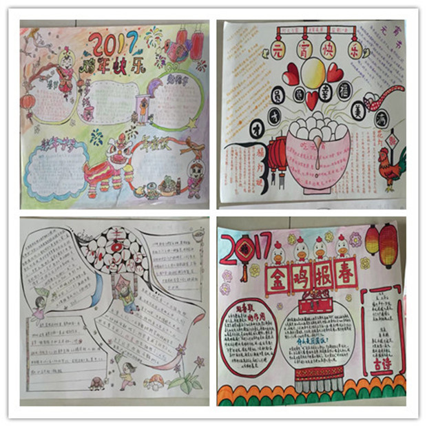 此次比赛同学们精心设计,有的发挥自己的绘画特长,用自己独到的见解画出了自己心目中的春节,有的同学展示自己的文学功底,以充满情感的文字描述出自己对祖国的热爱。精美的手抄报上,向大家展示了春节、除夕、元宵节的来历、风俗习惯,还有春节发红包的来历、各种春节祝福、猜灯谜等内容。通过制作手抄报,有的队员表达了欢度春节的情感,有的队员了解了中国的年俗文化,有的队员则写下了鸡年的希望……队员们用自己稚嫩的双手,真挚的情感,用画笔传递着对祖国、对家乡的热爱,用文字书写对祖国、对家乡美好的祝福。