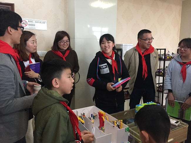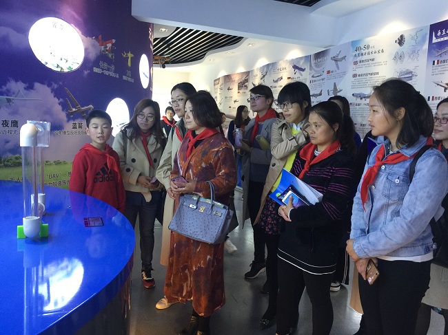 第三个议程:看阵地 全体工作室成员参观了学校刚建立的、崭新现代的航空科普馆,在红领巾讲解员的引导下,辅导员老师们久久驻足于此,认真解读墙面上的每一个知识点,兴趣盎然地观察每一架飞机模型。同时,参加活动的辅导员走进学校的“春芽创客社团”,现场观摩了创客社团的队员们给大家带来的机器人“寻迹”展示,辅导员们饶有兴趣地亲身体验创客教室的各项设备使用,直夸奔牛实小的队员真棒。