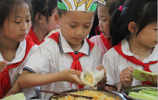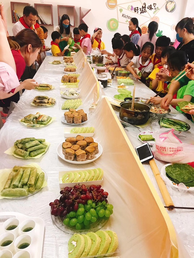 展社团——美味 分享 走进春小“快乐小厨房”传统美食社团,队员们展示了在自己家里和父母一起学习春江的传统美食(春卷、春饼)的制作,并创新了小麦汁蛋糕。活动现场,他们用自己灵巧的小手,为现场的辅导员们制作了一道道美味,向辅导员老师分享了他们寻访的收获与快乐。