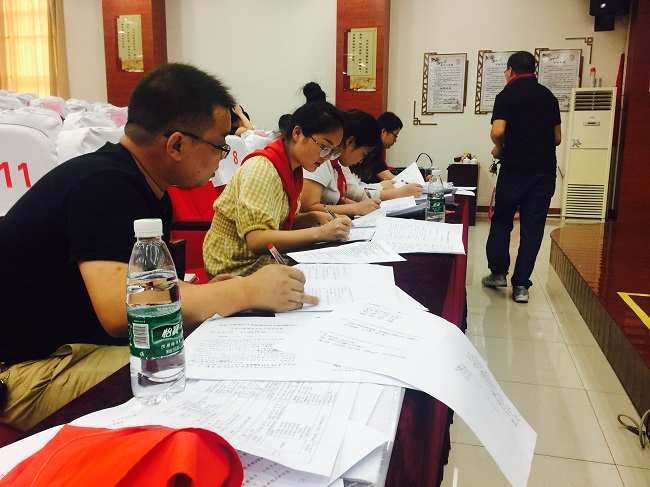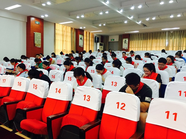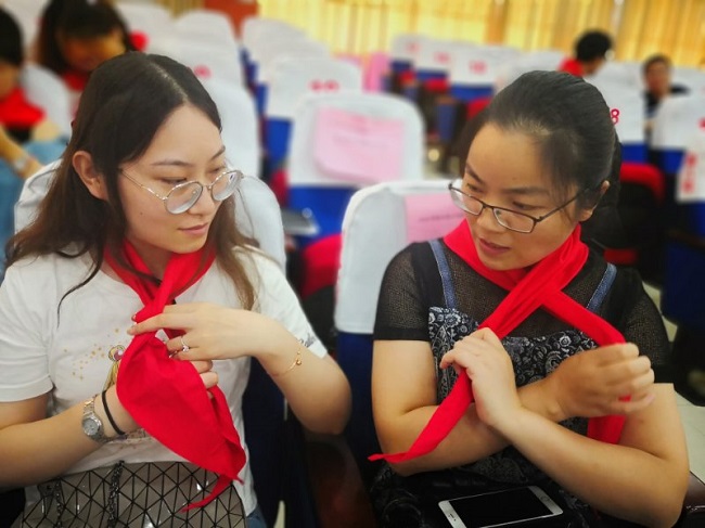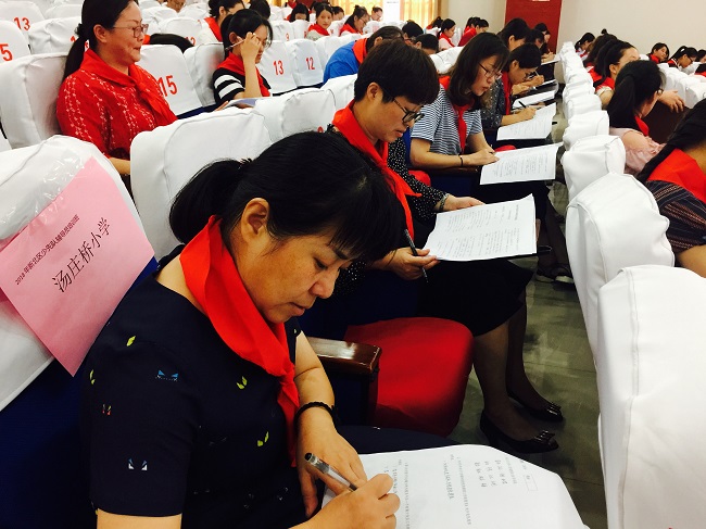 两项笔试:赛前,各校大队辅导员结合结合团常委文件要求,提交一份红领巾寻访活动材料。开班仪式后,中队辅导员进行少先队基础专业知识考试。通过现场闭卷考试的形式考察中队辅导员对政策理论和专业知识的掌握,清晰反映出中队辅导员对习近平新时代中国特色社会主义思想、党的十九大精神、少先队改革方案、少先队章程以及基础队务等方面内容的学习情况,这些知识是辅导员开展队工作的最有力支撑。看!辅导员们一个个奋笔疾书,都是有备而来的架势。