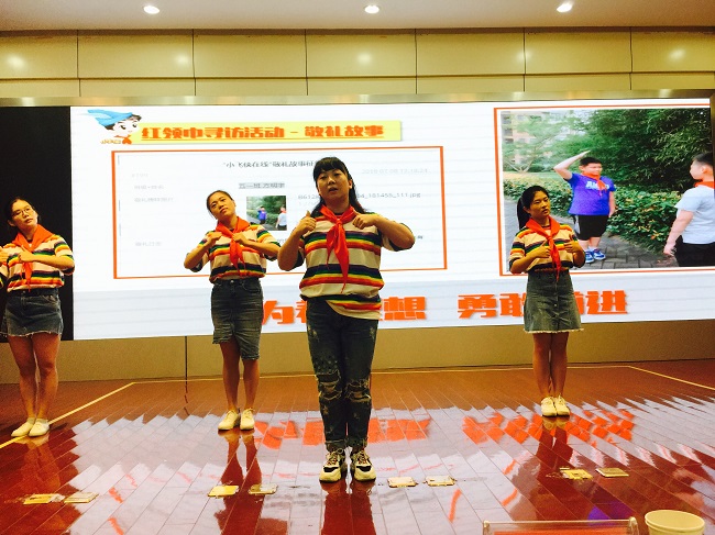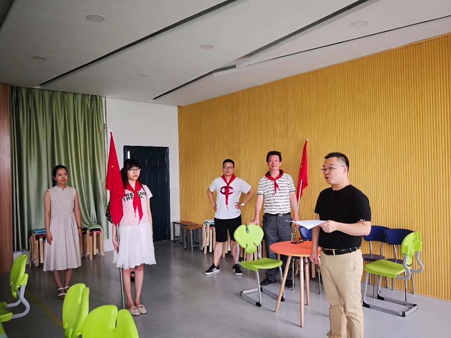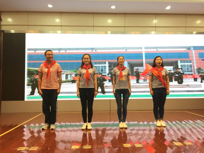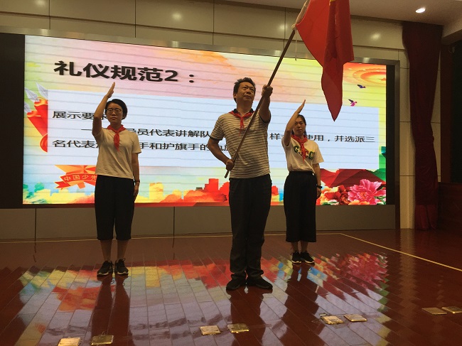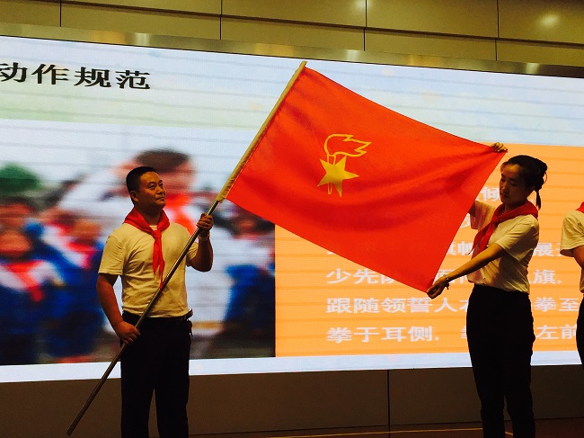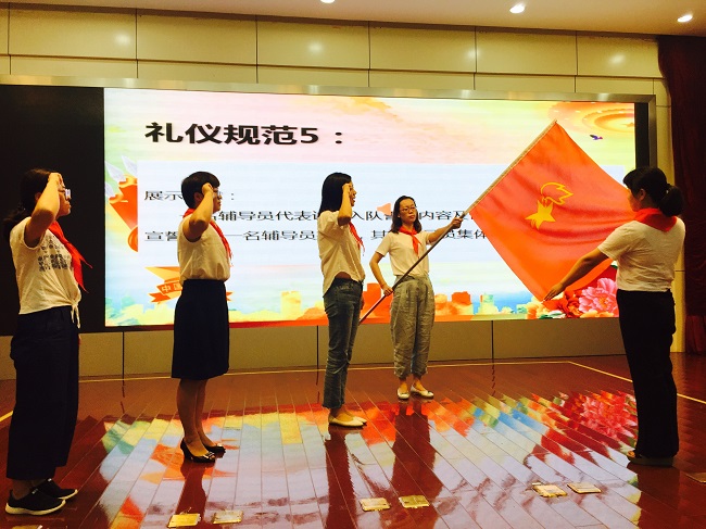 五项礼仪规范:从简单的规范系红领巾,到旗手执旗的规范动作,再到严谨的队会仪式……辅导员们全情投入,争分夺秒进行排练。舞台上那标准的敬礼、饱满的精神、昂扬的气势无一不展示出新北少先队辅导员们专业的素质、青春的风采以及对少先队的热爱。