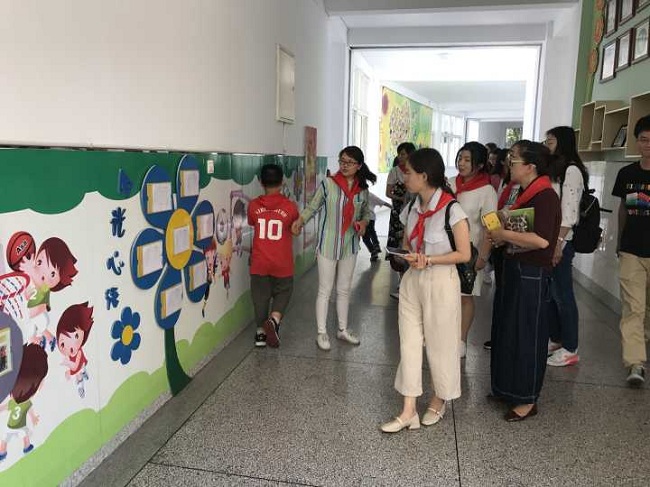 看阵地:小人书“萌” 金手指“靓” 辅导员们在泰山小学大队辅导员李春花老师的带领下欣赏学校“心花朵朵开”队员评价长廊,走进学校少先队品牌特色场馆“小人书馆”和“金手指”活动课程研发中心,惊喜的神色露在脸上,赞叹的话语传递在嘴边。
