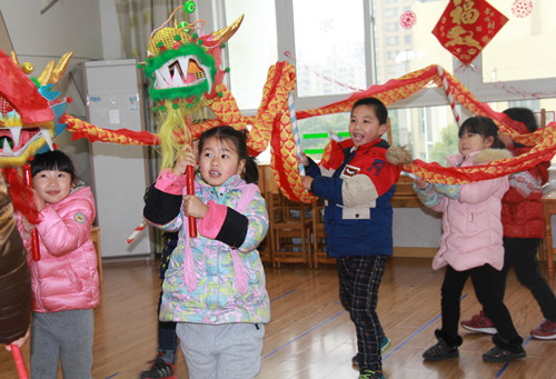 伴着冬日温暖的阳光,新年的大门即将向我们打开;伴着多彩的游戏,龙幼玲珑大班“龙娃迎新年”——民间游戏游园会正在缤纷开启。这里有“方言馆”、“舞龙馆”、“剪纸馆”……2018年1月23日这一天,玲大的孩子们置身于民间游戏和快乐迎新的氛围中,体验着民俗文化,感受着新年气息。 策划篇:集思广益共谋划 新年,作为一个崭新的开始,代表了新的篇章和希望。继前几次“乐享节日”活动的成功开展后,本学期玲大年级组借助以往的成功经验,沿用“游园”的形式,并在此基础上进行创新。各班教师结合孩子的兴趣点,设计了有班级特色的民间游戏方案,最终形成了本次“龙娃迎新年——民间游戏游园会”的完整方案。 准备篇:齐心协力焕新貌 本次“龙娃迎新年——民间游戏游园会”活动增加了许多中国元素、民俗文化。因此,在玲大教师和孩子们的精心布置下,整个楼层也充满了新年喜庆的气氛。有的班级是家长与幼儿共同制作的窗花,经过师幼的一番改造,更显古色古香;有的班级制作的一串串鞭炮,让节日的喜庆气氛更加浓厚;有的班级你会看到用红包制作的各式各样的灯笼,年味十足……各班还根据本班特色,布置了有相应游戏场特色的环境,民俗文化和新年特色随处可见。 现场篇:欢天喜地迎新年 在孩子们的翘首期盼下,1月23日上午,各个游戏场正式开放啦!上午9点整,孩子们三五成群,两两结对,手持游戏护照入园,根据个人喜好自主选择游戏场,开始了快乐的民间游戏之旅!民俗美工“剪纸馆”,孩子们体验剪纸的乐趣,感受艺术的魅力所在;“舞龙”场馆中,孩子们真实地舞龙体验,考验着孩子和同伴之间的默契;“大力士”的场馆里更是热火朝天,孩子们两两对面,信心十足,哨声一响,孩子们十足力气,奋力拼搏;孩子们5人一组,团结合作,各个都使出浑身解数,想要一争高下,一阵阵加油呐喊声在“拔河”场馆中此起彼伏;移步“夺冠馆”,孩子们的兴趣更浓了,伴随着“一米一米一,三米三……”的儿歌,孩子们玩起了“抢皇帝”的游戏……个个场馆人头攒动,个个场馆趣味十足,个个场馆笑声不断。 此次活动在孩子们的欢笑声中结束了。如此充满“年味”的民间游戏活动,相信留给孩子的不光是游戏的乐趣,更多的是民间文化的浓浓熏陶。新年即将到来,希望孩子们带着今天的美好回忆,用他们的热情抒写着属于明天的精彩!