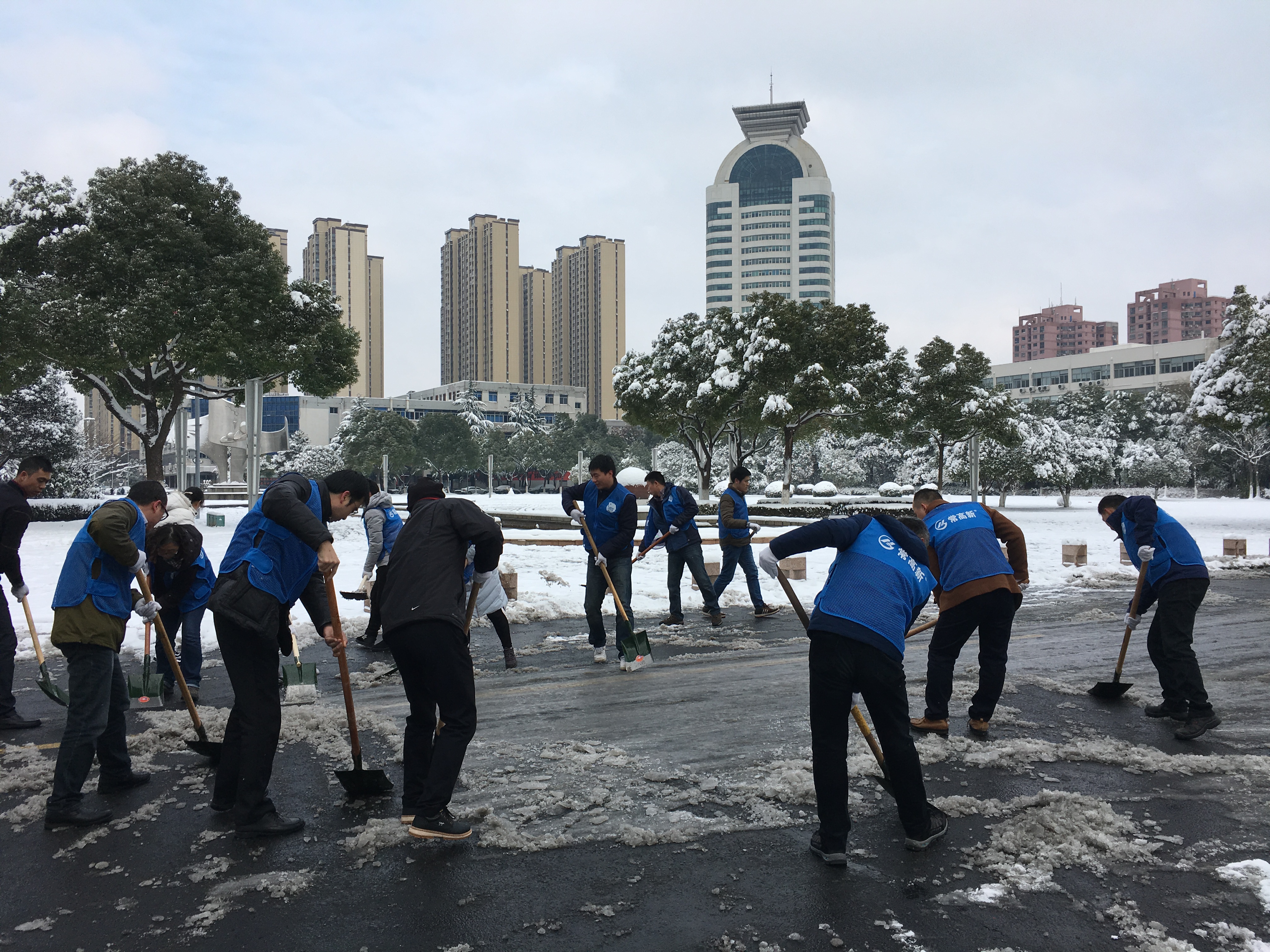常州市气象台发布暴雪黄色预警,1月25日的暴雪导致道路积雪严重,26日早晨已经冰冻的道路给群众出行带来了严重的安全隐患。根据集团应对暴雪的应急工作要求,常高新集团团委在微信群内组织青年职工开展“义务铲雪志愿活动”,得到了集团青年以及广大职工的积极响应。常金控、建运事业部等其他子公司也自发组织职工开展志愿活动,先后有100余人加入到铲雪的队伍中,全力保障了科五路全线和科二路的畅通,消除了冰冻道路的安全隐患。