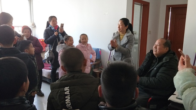 2018年2月8日下午,社区爱心家长李女士带着自家的孩子以及其他爱心青少年一同再次探访了家住盘龙苑57幢的残疾人刘师傅。刘师傅是社区一户失独家庭,长期以轮椅为代步工具,与年迈的父母生活在一起,孩子们亲切地称呼他为轮椅叔叔。 2016年时小志愿者们与这位特殊的叔叔结成了帮扶对子,定期探望。新春伊始,新年将近,小志愿者们想起了这位轮椅叔叔,想向他拜个早年。轮椅叔叔知道孩子们要来,守望在路口,看到孩子们的身影,笑的合不拢嘴。孩子们喜欢轮椅叔叔,轮椅叔叔笑着面对生命挫折的坚韧打动着孩子们,孩子们与轮椅叔叔亲切攀谈,表演节目,最后孩子们祝轮椅叔叔新春快乐,吉祥如意,现场气氛和乐融融。