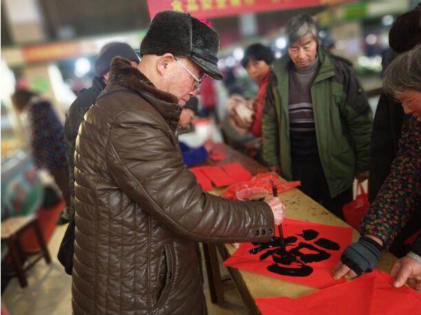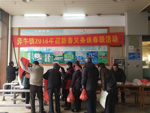 新春佳节即将来临,为了进一步营造过新年的浓厚氛围,2月9日上午,一年一度的“迎新春·送春联”活动在奔牛镇集贸市场举行。奔牛镇文体站、团委组织了镇书法协会的8名会员,开展了现场义务送春联、赠福字活动。短短1个半小时的活动,共向过往群众免费赠送春联及福字350多幅,书法协会老师们精湛的书写技艺,得到了群众的一致好评。