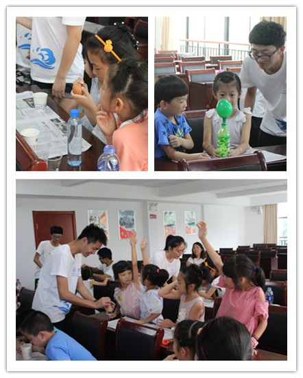 7月10日,河海大学常州校区青年志愿者协会小水滴暑期社会实践队在祥龙社区团委工作人员带领下前往文体活动中心,给社区的小朋友们带来了一堂充满趣味性的实验公开课,旨在提高他们对于科学的兴趣,培养他们的探索精神。 参与的小朋友大多是小学一到三年级学生,还有幼儿园的小朋友在家长陪同下参与,实验过程中,小朋友们都一直满怀兴奋,饶有兴趣地、认真地听青年志愿者讲解。回答问题都特别积极,高高举着手,抢着回答。做“汽水喷泉”的时候,看着汽水快速地涌出瓶口,他们形象地将其比喻成火山爆发;当有志愿者在台上为他们演示“鸡蛋画”的时候,还有位小朋友惊奇地称其为“超能魔术师”,其他小朋友也连连拍手…… 实验是以小组的形式进行,近距离地观察操作,更能让小朋友们了解实验原理,提高他们的兴趣。在实践中尽可能地宣扬勤俭节约的精神,在保证了实验效果的同时,不浪费材料;志愿者们还鼓励他们多帮家里做做家务,少喝可乐,少吃糖。小朋友们都很聪明,在分组活动中所表现出的团队合作能力很令人吃惊。最后,青年志愿者和小朋友们一起合影留念。
