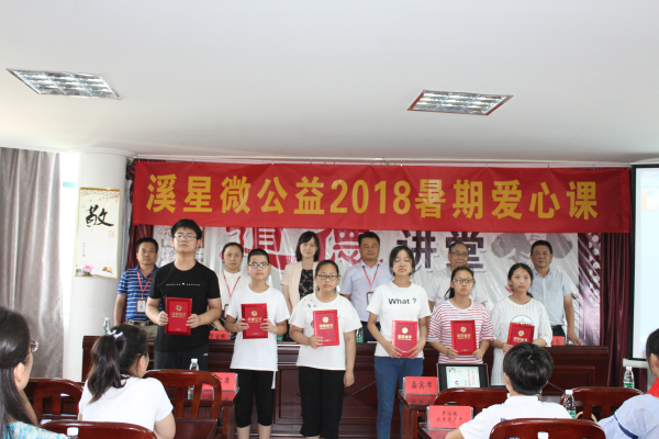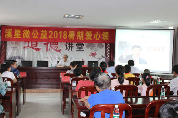7月23日下午,罗溪镇空港社区会议室热闹非凡,来自全镇各村社区的70多位小朋友们共同参加溪星微公益2018开班仪式。共青团新北区委书记张沁怡、罗溪镇党委副书记徐惠、镇关工委主任周金忠、镇宣传统战委员贺宝琛参加开班仪式。 会上,徐惠书记为大家作了开班动员。徐惠介绍了溪星微公益2013年以来的丰硕成果和今年的课程计划,并预祝2018暑期爱心课圆满成功!